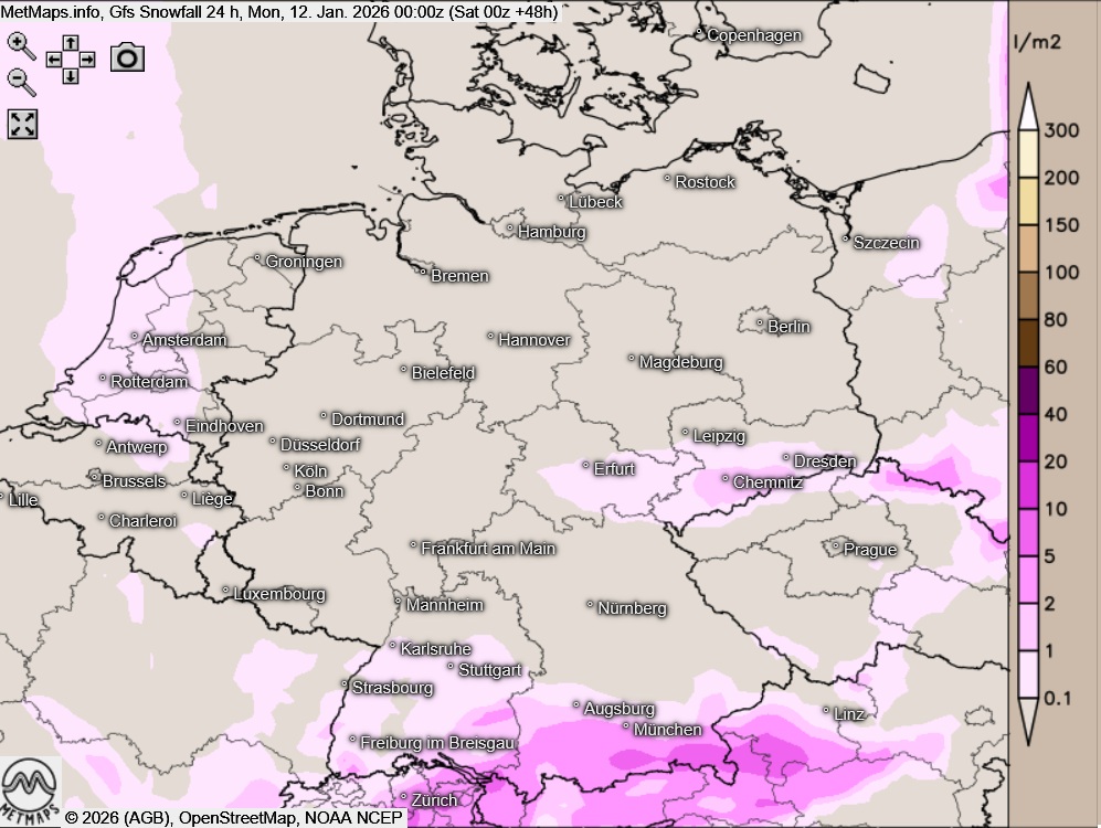 Die Sechs-Stunden-Temperaturminima bis 06:00 Uhr, die Wetterkarte für 06:00 Uhr sowie die 24-Stunden-Schneemengen am Sonntag nach GFS: