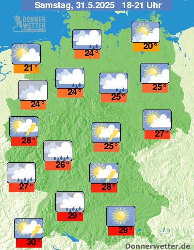 Heute Abend ist es hier und da aufgelockert bewölkt, jedoch ziehen häufig kompakte Wolken durch und es können sich praktisch landesweit lokale Schauer und auch Gewitter bilden. Die Temperatur liegt bei warmen 20 Grad an der Müritz und bei schwülheißen 30 Grad im Breisgau.