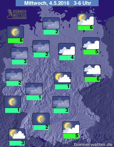 In der folgenden Nacht halten sich über dem Südosten und dem äußeren Osten des Landes noch überwiegend dichte Wolken, die auch zeitweise Regen bringen können. Über dem übrigen Osten und Nordosten ist es teils stark, teils aufgelockert bewölkt, jedoch trocken. Weiter nach Westen hin zeigt sich der Himmel weitestgehend sternenklar, hier und da sind ein paar Wolken möglich, dabei bleibt es trocken. Die Temperatur sinkt auf 6 Grad an der Oder und auf kalte 1 Grad am Taunus.