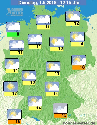Heute Nachmittag halten sich über Niedersachsen und Schleswig-Holstein dichte Wolken mit zeitweiligem Regen. Südlich und östlich dieses Regengebiets zeigt sich zunehmend die Sonne zwischen den lockeren Wolken. Oft dichte Wolken halten sich jedoch im Südosten Deutschlands, dabei bleibt es aber trocken. Die Temperatur liegt bei sehr frischen 8 Grad an der Nordsee und 18 Grad in der Lausitz.