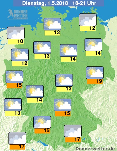 Heute Abend halten sich über dem Süden Deutschlands sowie an den Küsten meist dichte Wolken, dabei bleibt es aber weitgehend trocken. Im übrigen Bundesgebiet ist es verbreitet heiter oder wechselnd bewölkt, dabei bleibt es trocken. Die Temperatur liegt bei 10 Grad in Emden und etwa 19 Grad in Dresden.