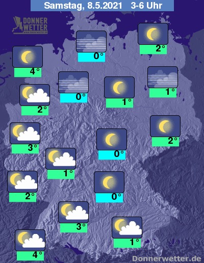In der kommenden Nacht ist der Himmel überwiegend sternenklar. Im Laufe der zweiten Nachthälfte ziehen im Süden und Westen jedoch einige, meist lockere Wolken herein, dazu bleibt es trocken. Die Temperatur sinkt auf 4 Grad an der Ems und bis 0 Grad im Thüringer Becken.