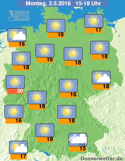 Heute Nachmittag ist es am Alpenrand meist dicht bewölkt und es bilden sich zeitweise Schauer. Im übrigen Land scheint hingegen verbreitet die Sonne von einem oft wolkenlosen Himmel. Besonders im Nordseeumfeld und über Sachsen ziehen auch einige lockere Wolken durch, dazu bleibt es trocken. Die Temperatur steigt auf 15 an der ostfriesischen Küste und bis 20 Grad in Düsseldorf.