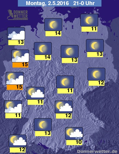 Heute Abend bilden sich am Alpenrand bei oft starker Bewölkung einzelne Schauer. Im Westen und Nordwesten ziehen einige, meist noch aufgelockerte Wolken auf, dabei bleibt es genauso trocken wie im übrigen Bundesgebiet, wo sich der Himmel weitgehend sternenklar zeigt. Die Abendtemperatur liegt bei milden 15 Grad am Niederrhein und etwa 10 Grad im Raum München.