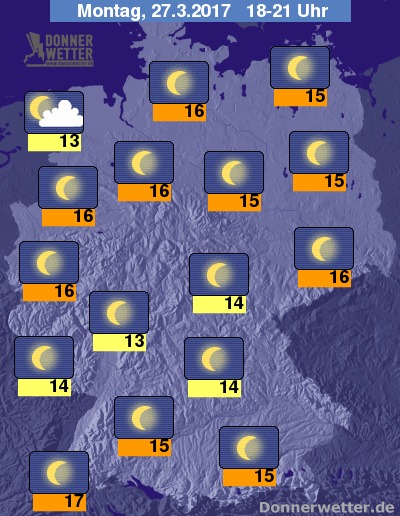 Heute Abend ist der Himmel über dem Bundesgebiet verbreitet sternenklar, nur in Küstennähe sind hier und da einige Wolken möglich, dabei bleibt es trocken. Die Abendwerte liegen bei milden 13 bis 17 Grad.