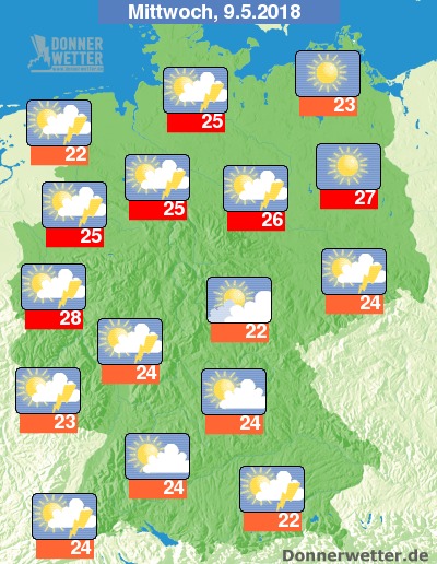 Am Mittwoch ist es zunächst noch verbreitet sonnig und dabei trocken. Bereits ab den Mittagsstunden nimmt die Bewölkung vielerorts zu und es bilden sich einzelne Schauer, zudem sind auch Gewitter möglich, häufig bleibt es aber auch trocken. Die Temperatur steigt auf 22 Grad im nördlichen Emsland und bis 28 Grad im Rheinland.