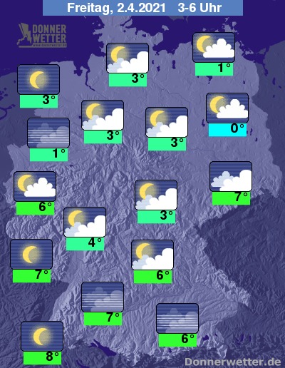 In der bevorstehenden Nacht ist es im Süden und Nordwesten des Landes häufig sternenklar, sonst ist es jedoch meist wechselnd oder stark bewölkt. Über Sachsen und dem südlichen Bayern können sich vereinzelt Schauer bilden, sonst bleibt es aber weitgehend trocken. Die Temperatur sinkt auf 8 Grad in Freiburg und bis Werte um 0 Grad im Berliner Umland.