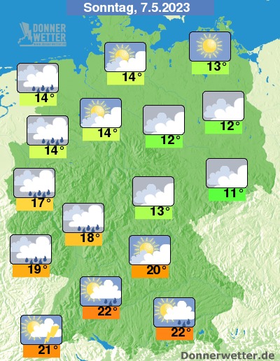 Am Sonntag ist es in den westlichen Landesteilen, sowie im Südwesten und äußeren Süden bedeckt und es fällt häufig Regen, örtlich können sich auch Gewitter entwickeln. Im übrigen Land ist es aufgelockert bis stark bewölkt und dazu weitgehend trocken. Direkt an der Ostsee ist es verbreitet heiter bis sonnig und trocken. Die Temperatur steigt auf 11 Grad in der Lausitz und bis 22 Grad im Raum München.