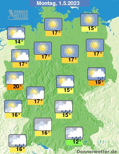 Am Montag ist es über dem Süden und im weiteren Verlauf auch teils über Sachsen stark bewölkt und es fällt gebietsweise Regen. Weiter nach Norden hin scheint hingegen häufig die Sonne und es ziehen meist nur lockere Wolkenfelder durch. Die Temperatur steigt auf 12 Grad in München und bis 20 Grad in Köln.
