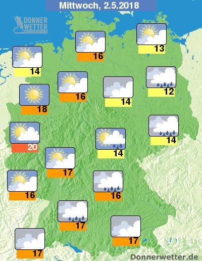 Der Himmel präsentiert sich häufig von seiner freundlichen Seite. In der Südosthälfte wird es zeitweise wolkiger und am Alpenrand besteht leichte Schauerneigung. Höchstwerte 15 bis 21, an den Küsten örtlich nur 12 Grad.