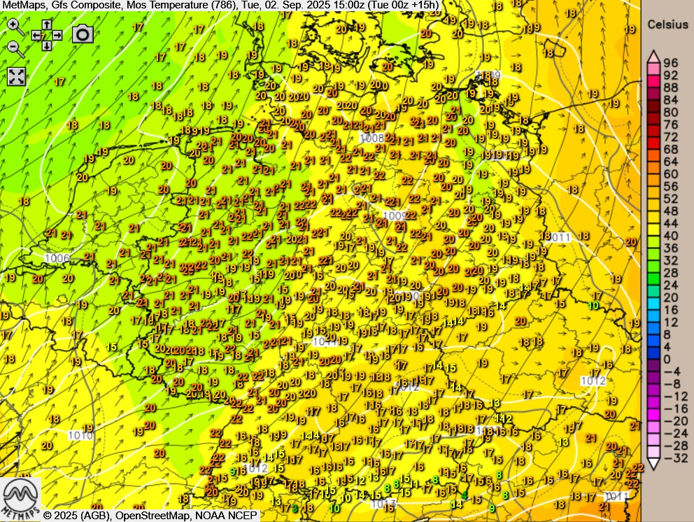 Die Strömungs- und Temperaturkarte für Dienstagnachmittag (15:00 Uhr) sowie die Sechs-Stunden-Regenmengen bis 21:00 Uhr nach GFS.