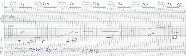 Unsere Grafik zeigt den Luftdruckverlauf im Zeitraum 25.4. bis 02.05.2016. Hochdruckwetter stellt sich in dieser ersten Maiwoche ein: