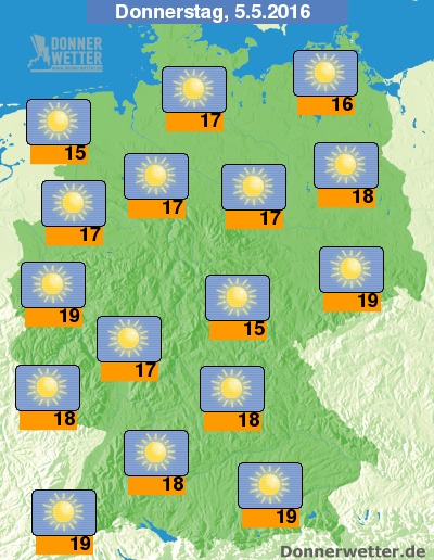 Christi Himmelfahrt und der Brückentag bringen bereits deutschlandweit heiteres bis sonniges Frühlingswetter. An Vatertag steigen die Temperaturen dabei auf Werte um 16 bis 19 Grad C, am Freitag werden sogar Tageshöchsttemperaturen um 18 bis 22 Grad C erreicht.
