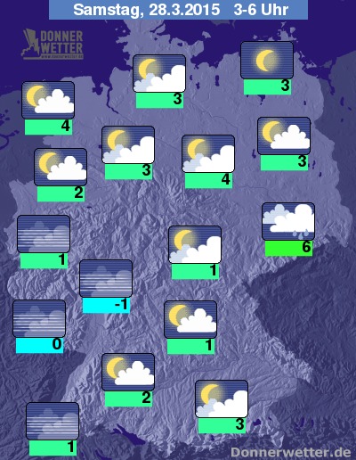 In der folgenden Nacht klart der Himmel sowohl in der Südwesthälfte als auch im Nordosten des Landes verbreitet auf, gebietsweise halten sich auch lockere Wolken, dazu bildet sich stellenweise Nebel oder Hochnebel. In Niedersachsen bleibt es häufig stark bewölkt, in Sachsen-Anhalt und Sachsen auch oft bedeckt, hier ist gelegentlich Regen oder Sprühregen möglich, sonst bleibt es trocken. Die Temperatur sinkt auf 6 Grad in Dresden und bis -1 Grad im Siegerland.