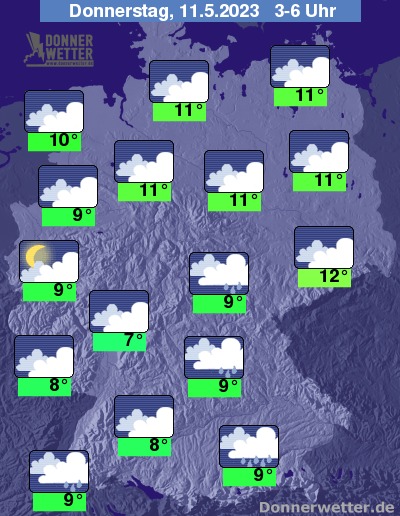 In der Nacht zum Donnerstag fällt unter dichten Wolken vom Südosten, über den Osten bis in den Nordosten gebietsweise Regen. In den westlichen Landesteilen ist es zum Teil wechselnd bis aufgelockert bewölkt, im übrigen Land dagegen meist dicht bewölkt, jedoch weitgehend trocken. Die Temperatur sinkt auf 12 Grad in Dresden und 7 Grad in Wiesbaden.