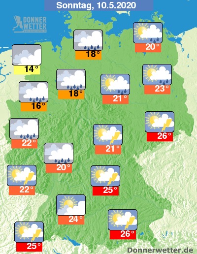 Am Sonntag zeigt sich das Wetter überwiegend stark, zum Teil auch aufgelockert bewölkt, dabei bilden sich gebietsweise Schauer, über der Südhälfte und im Osten entwickeln sich auch örtliche Gewitter. Die Temperatur steigt auf kühle 14 Grad an der Nordseeküste und bis 26 Grad in Dresden und München.