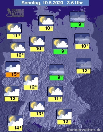 In der Nacht zum Sonntag sind über dem Alpenvorland weiterhin einzelne Schauer möglich. Im übrigen Bundesgebiet ist es oft nur gering bis aufgelockert, selten auch stark bewölkt und es bleibt weitgehend trocken. Die Temperatur sinkt auf milde 15 Grad in Bonn und bis 9 Grad an der Müritz.