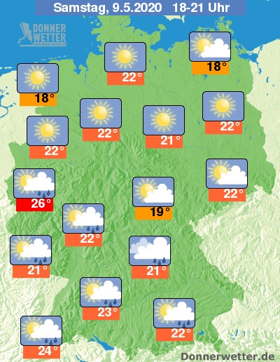 Heute Abend ist es besonders im Norden weitgehend sonnig und trocken, über der breiten Landesmitte ist es auch oft locker bis aufgelockert, teils auch stark bewölkt, dazu sind nur noch selten Schauer möglich. Im Süden bilden sich bei oft starker Bewölkung vielerorts Schauer und auch einzelne Gewitter sind möglich. Die Temperatur liegt bei rund 18 Grad an den See und bis zu 26 Grad in Köln.