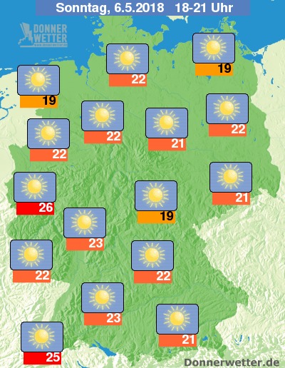 Am Montag zeigt sich das Wetter wiederum verbreitet sonnig, bei wolkenlosem Himmel bleibt es trocken. Die Temperatur steigt auf 20 Grad im Vogtland und bis 26 Grad in Bonn.