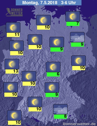 In der Nacht zum Montag zeigt sich der Himmel sternenklar, dazu bleibt es trocken. Die Temperatur sinkt auf 13 Grad in der Kölner Bucht und bis 6 Grad im Thüringer Becken.