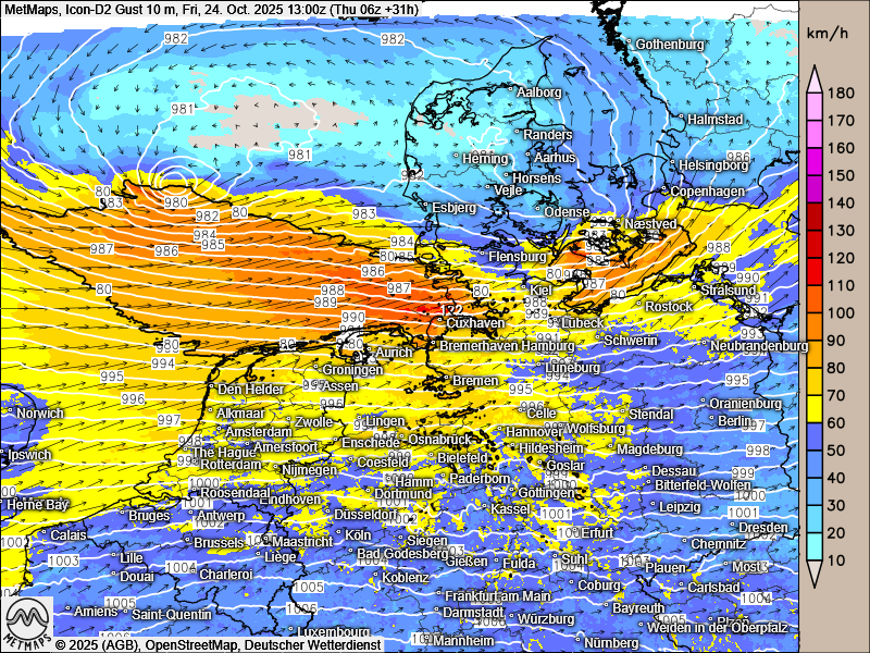 Hier die Aussichten für morgen mit Sturm und Orkan an den Küsten: