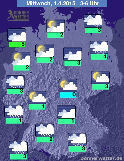 In der Nacht zum Mittwoch bleibt die Bewölkung in der Südwesthälfte und im Nordosten des Landes weitgehend dicht und es fällt immer wieder teils kräftiger Regen, oft auch mit Graupel oder Schnee. In einem breiten Streifen von Niedersachsen bis nach Sachsen lockert die Bewölkung oft auf und es bleibt größtenteils auch trocken. Die Temperatur sinkt auf 5 Grad an der Ems und bis 0 Grad am Thüringer Wald. Es weht meist starker bis stürmischer Wind mit der Gefahr von schweren Sturmböen. An den Küsten und auf den Bergen herrscht oft Sturm, dazu sind orkanartige Böen möglich.