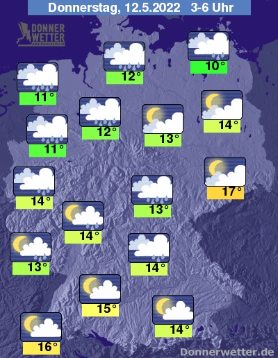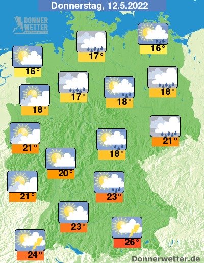 Am Donnerstag halten sich anfangs im Nordosten und Osten noch oft dichte Wolken und es bilden sich gebietsweise Schauer. Im Süden bleibt es zumeist heiter und trocken, wobei örtliche Schauer und auch Gewitter nicht ausgeschlossen sind. Im übrigen Land ist es teils heiter, teils ziehen einige Wolken durch, dabei bleibt es überwiegend trocken. Die Temperatur steigt auf 16 Grad in Neubrandenburg und bis 26 Grad in München.