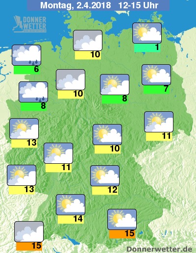 Heute Nachmittag kann sich zwischen einigen, oft nur lockeren Wolken häufig die Sonne zeigen. Meist dichte Wolken ziehen jedoch über den Nordwesten und im weiteren Verlauf auch den Norden und Westen Deutschland hinweg, dabei fällt gebietsweise auch Regen, sonst bleibt es aber trocken. Die Temperatur liegt bei 1 Grad an der Müritz und bis 15 Grad in München.