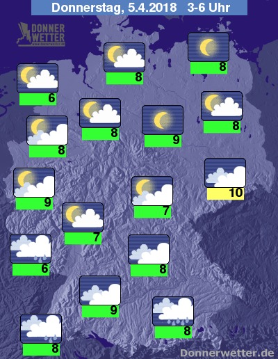 In der Nacht zum Donnerstag fällt im Südosten und im übrigen Alpenvorland zeitweise Regen. Dichte Wolken halten sich auch weitgehend über der übrigen Südhälfte des Landes. Weiter nördlich zeigt sich der Himmel hingegen meist locker bewölkt, hier und da wird es sogar sternenklar, dazu bleibt es trocken. Die Temperatur sinkt auf 10 Grad in Dresden und bis 6 Grad im Saargau.