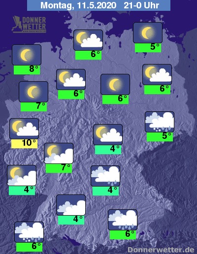 In den Abendstunden wechseln sich im Norden und Westen Sonne und wechselnde Bewölkung ab, Schauer sind dabei nur noch selten zu erwarten. Im Süden und Südosten bleibt die Wolkendecke weitgehend geschlossen und immer wieder fällt Regen, in höheren Lagen auch mit Schneeregen durchmischt.
