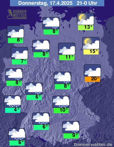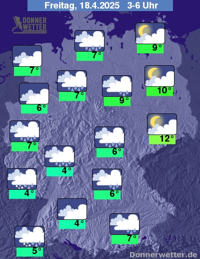 In der Nacht zum Freitag bleibt es bei wechselnder Bewölkung trocken. In den übrigen Landesteilen überwiegt dichte Bewölkung oder es ist bedeckt, dabei fällt verbreitet schauerartiger und teils gewittriger Regen.