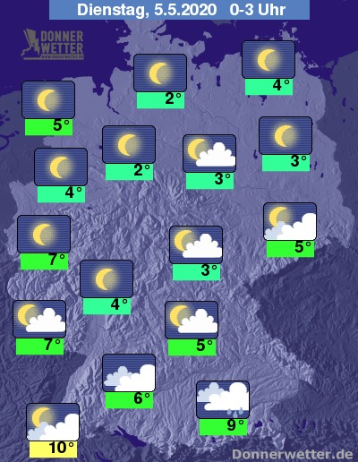 In der Nacht auf Dienstag funkeln die Sterne im Norden und Westen des Landes von einem meist sternenklaren Himmel. Entlang der Weser kann sich in den frühen Morgenstunden Nebel bilden. In den übrigen Landesteilen überwiegt ein Mix aus lockerer oder aufgelockerter Bewölkung. Südlich der Donau bleibt es in den nächsten Stunden auch noch stärker bewölkt, am Alpenrand können zudem einzelne Schauer fallen.