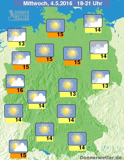 Am späten Nachmittag und am Abend sind vor allem im äußeren Osten noch zum Teil dichtere Wolken unterwegs, die jedoch kaum noch Regen bringen. Einige, meist nur lockere Wolken ziehen auch über die westlichen Landesteile, im übrigen Bundesgebiet ist es verbreitet sonnig, es bleibt bundesweit trocken. Die frühen Abendtemperaturen liegen bei recht milden 16 Grad im Rheinland und um 13 Grad im Vogtland.