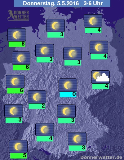 In der Nacht zum Donnerstag sind im Bereich der Donau und der Neiße zum Teil noch einige Wolken unterwegs, Regen fällt jedoch keiner. Im großen Rest der Republik zeigt sich hingegen ein sternenklarer Nachthimmel, dabei bleibt es natürlich trocken. Die Temperatur sinkt auf recht milde 8 Grad an der Nordseeküste und bis teils 0 Grad im Eichsfeld.
