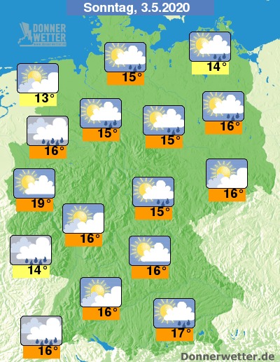 Am Sonntag zieht den Tag über wechselnde oder starke Bewölkung durch, über der Nordhälfte bilden sich dabei einzelne Schauer, im übrigen Bundesgebiet ist es bis auf vereinzelte Ausnahmen dagegen meist trocken. Die Temperatur steigt auf 13 Grad an der Nordsee und bis 19 Grad in der Kölner Bucht.