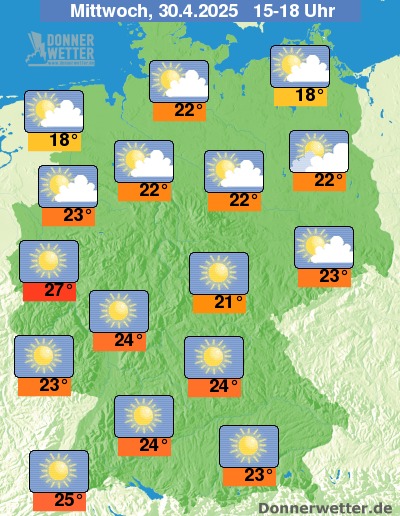 Am Mittwochnachmittag zeigt sich der Himmel über dem Norden und Nordosten sonnig, zeitweise können auch mal lockere Wolkenfelder durchziehen. In den übrigen Landesteilen scheint die Sonne am Nachmittag von einem meist wolkenlosen Himmel. Im südlichen Bergland sowie in den Alpen besteht ein geringes Schauer- und Gewitterrisiko.