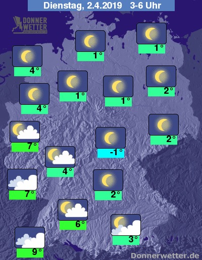 Die Temperaturen sinken auf Werte um 9 Grad C im Breisgau und um -1 Grad C im Thüringer Wald.