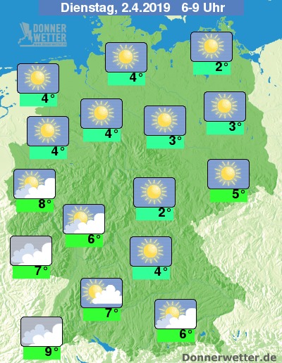 Der Dienstag startet im Norden und Osten Deutschlands mit viel Sonnenschein. Im Süden und Westen ist der Himmel meist stark bewölkt, zwischen Oberrhein und dem Pfälzer Wald auch teils bedeckt. Es bleibt aber meist trocken.