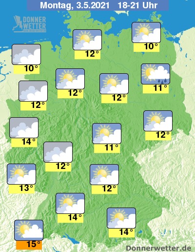 Heute Abend klingen letzte Schauer im Norden nach und nach ab und Auflockerungen werden häufiger, sonst ist es überwiegend aufgelockert, gebietsweise stark bewölkt und es bleibt trocken. Die Temperatur liegt bei 10 Grad in Rostock und bis 15 Grad in Freiburg.