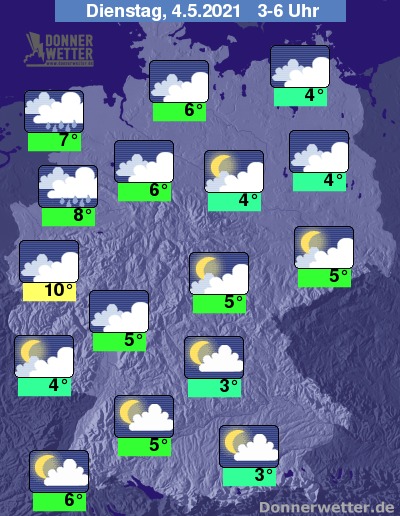 In der Nacht zum Dienstag ist es zunächst auch über der Nordwesthälfte noch oft aufgelockert bewölkt, jedoch nimmt die Bewölkung hier stetig zu und von Nordwesten zieht im Verlauf Regen herein. Im Süden und Osten bleibt es dagegen oft locker bis aufgelockert bewölkt und bis zum Morgen noch trocken. Die Temperatur sinkt auf 10 Grad in Köln und bis 3 Grad in Nürnberg.