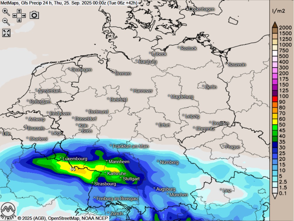 Die Wetter- und Temperaturkarte für Mittwochfrüh (06:00 Uhr) und die 24-Stunden-Regenmengen am Mittwoch nach GFS: