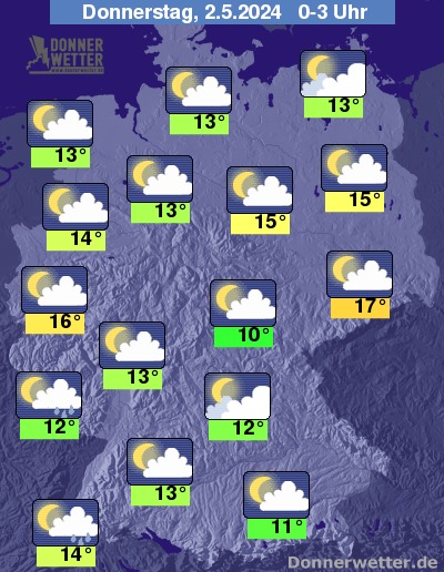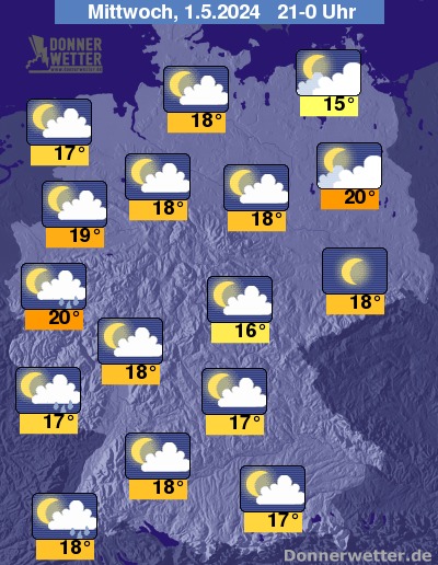 In der Nacht auf Donnerstag bleibt es über dem Westen und Südwesten wolkig, zeitweise kann dabei etwas Regen fallen, auch lokale Gewitter sind möglich. In den übrigen Landesteilen ist es sternenklar oder nur gering bewölkt und es bleibt trocken.