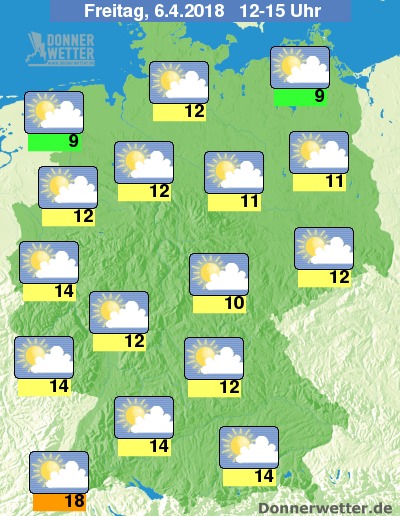 Dazu klettern auch die Temperaturen kräftig nach oben. Nur an den Küsten werden kaum mehr als 10 Grad erreicht, dafür liegen die Höchsttemperaturen vor allem an Rhein und Donau bei Werten um die 15 Grad, in Südbaden sind sogar bis zu 20 Grad möglich.
