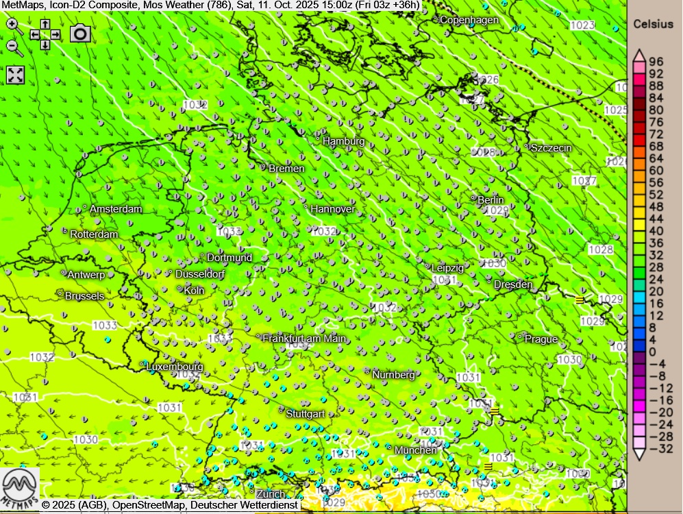 Am Samstagnachmittag zeigt sich der Himmel über dem Südwesten gebiets- und zeitweise wechselnd bis aufgelockert bewölkt. Sonst bleibt der Himmel auch am Nachmittag bedeckt oder es ist stark bewölkt. Im Norden und Osten kann dabei etwas Regen oder Sprühregen fallen, sonst bleibt es meist trocken.