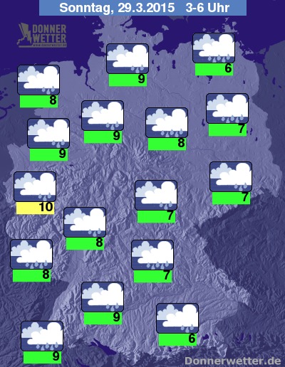 Am Sonntag bleibt es landesweit bei einer weitgehend geschlossenen Wolkendecke, dabei fällt immer wieder, zum Teil langanhaltender und auch ergiebiger Regen. Längere Regenpausen sind vor allem im Nordosten, aber auch im Osten Deutschlands zu erwarten, Auflockerungen bleiben aber auch hier selten. Die Temperatur steigt auf 9 Grad am Pfälzer Wald und bis 14 Grad in Leipzig. Der Wind weht zunehmend stark, gebietsweise auch stürmisch, auf den Bergen und an der Küste sind orkanartige Böen möglich.