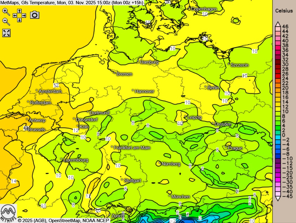 Am Montagnachmittag zeigt sich der Himmel über dem Norden und Nordwesten Deutschlands stark bewölkt und zeitweise fällt etwas Regen. In den übrigen Landesteilen überwiegt am Nachmittag heiteres Novemberwetter, vor allem im Süden scheint die Sonne auch von einem wolkenlosen Himmel - dabei bleibt es trocken.