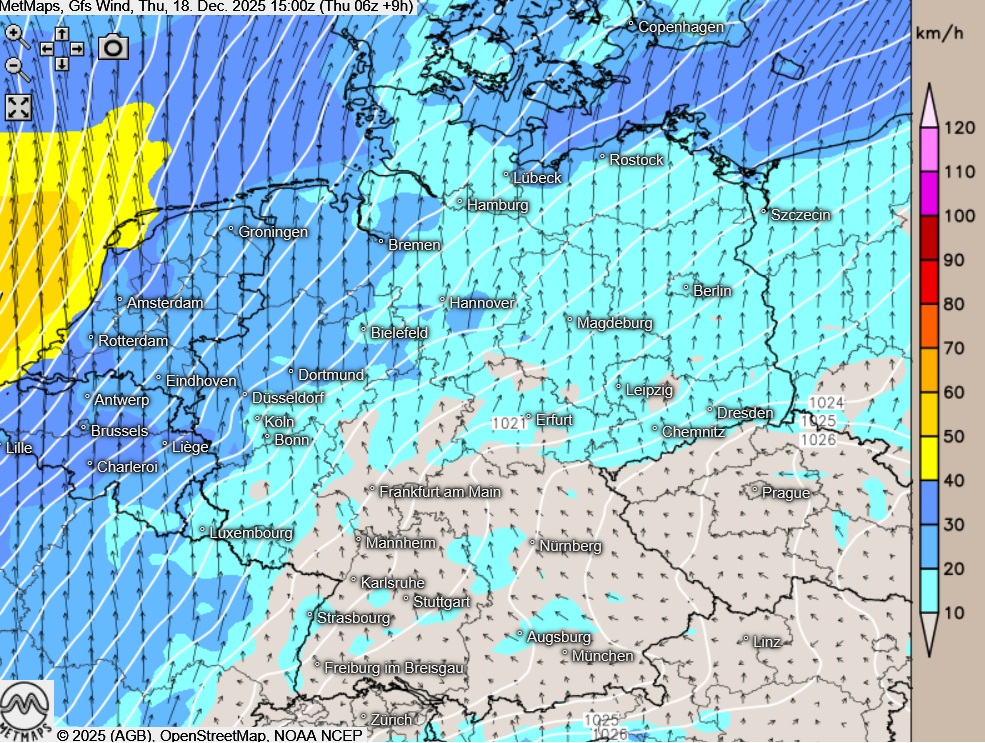Am Donnerstagnachmittag zeigt sich der Himmel über der Südosthälfte verbreitet heiter, teils kann sich hier aber auch in den Nachmittagsstunden zäher Nebel halten. Über der Nordwesthälfte dominiert in den nächsten Stunden starke Bewölkung, es bleibt aber überwiegend niederschlagsfrei.