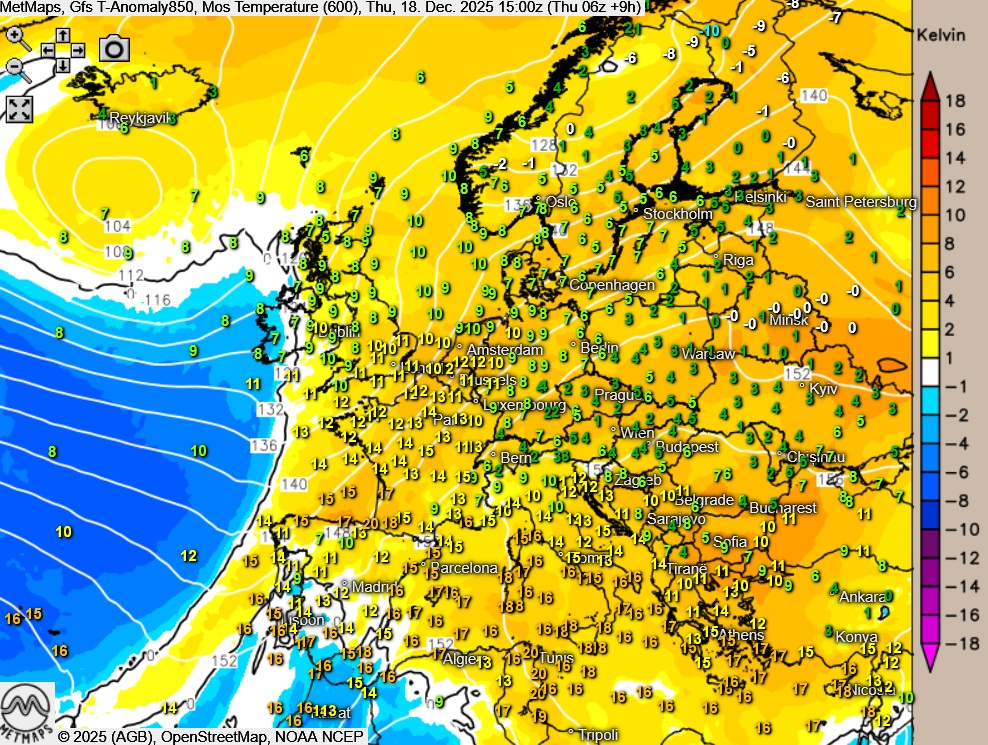 Die Temperaturen / Temperaturabweichung in Europa und die Böen- / Wetterkarte für Deutschland am Donnerstagnachmittag nach GFS: