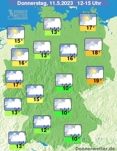Heute Nachmittag zeigt sich das Wetter zumeist stark bis dicht, im Nord- und Ostseeumfeld, sowie im Osten auch häufig aufgelockert bewölkt, hier bleibt es zumeist trocken, sonst bilden sich aber vielerorts, zum Teil auch kräftige Schauer. Die Temperatur liegt bei 10 Grad in Augsburg und etwa 19 Grad in Dresden.