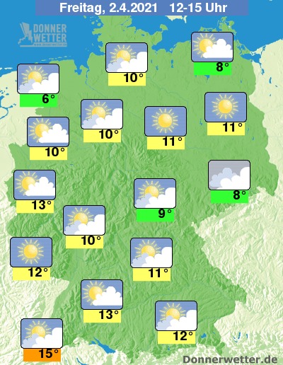 Heute Nachmittag ist es vor allem im Norden, aber auch im Alpenvorland gebietsweise stark bewölkt. Sonst und im übrigen Bundesgebiet scheint häufig die Sonne und meist zieht nur lockere Bewölkung durch, dabei bleibt es trocken. Die Temperatur liegt bei teils nur 6 Grad an der Nordsee und bis 15 Grad im Breisgau.